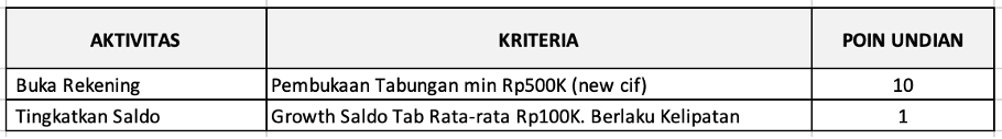 Nasabah akan mendapatkan kupon undian dari pembukaan rekening dan peningkatan saldo rata-rata setiap bulan. Semakin tinggi peningkatan saldo, semakin besar kesempatan untuk memenangkan hadiah.