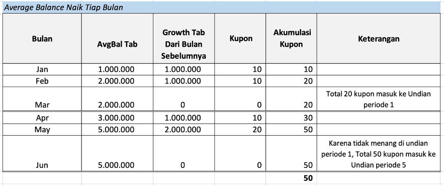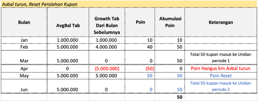 - Kupon akan hangus bila saldo rata-rata Tabungan mengalami penurunan dibanding bulan sebelumnya. Kupon yang sudah terakumulasi akan ter-reset menjadi 0 dan perhitungan kupon akan dimulai kembali pada bulan berikutnya.